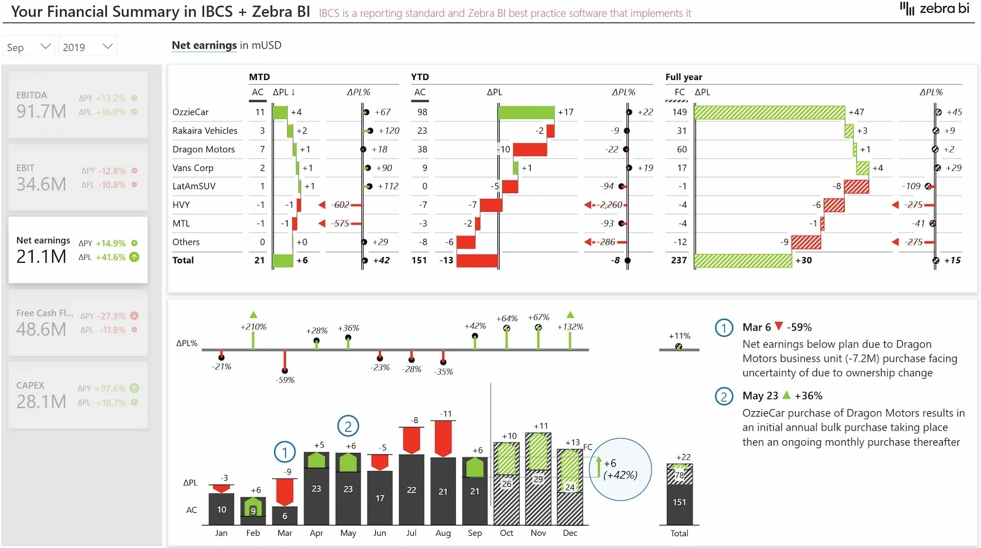 International Business Communication Standards (IBCS.com) is a reporting best practice that, with a little training, empowers teams to create and consume reports more efficiently. Implementation can range from free Excel basics to advanced Microsoft Power BI + Zebra BI dynamic dashboards as shown below.